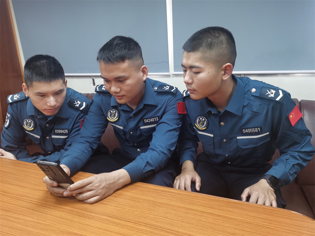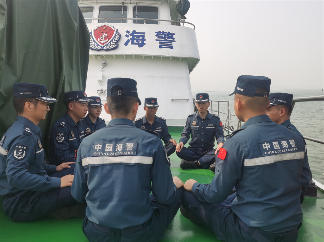 圖為執(zhí)法員正在甲板上進行國家安全主題討論交流。