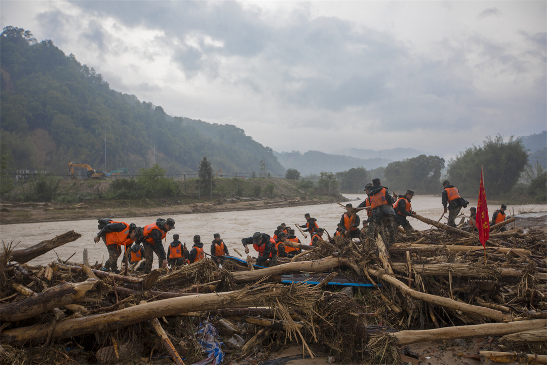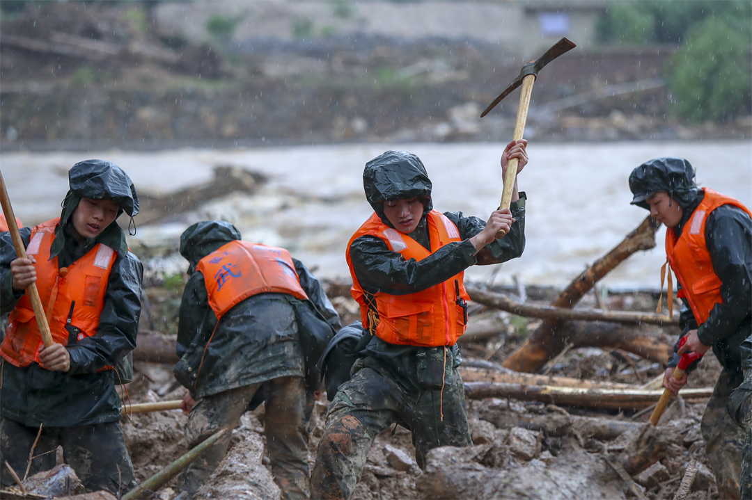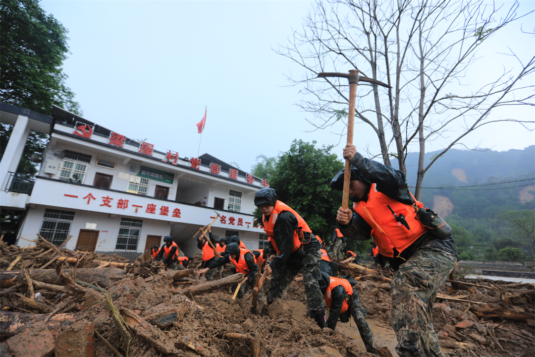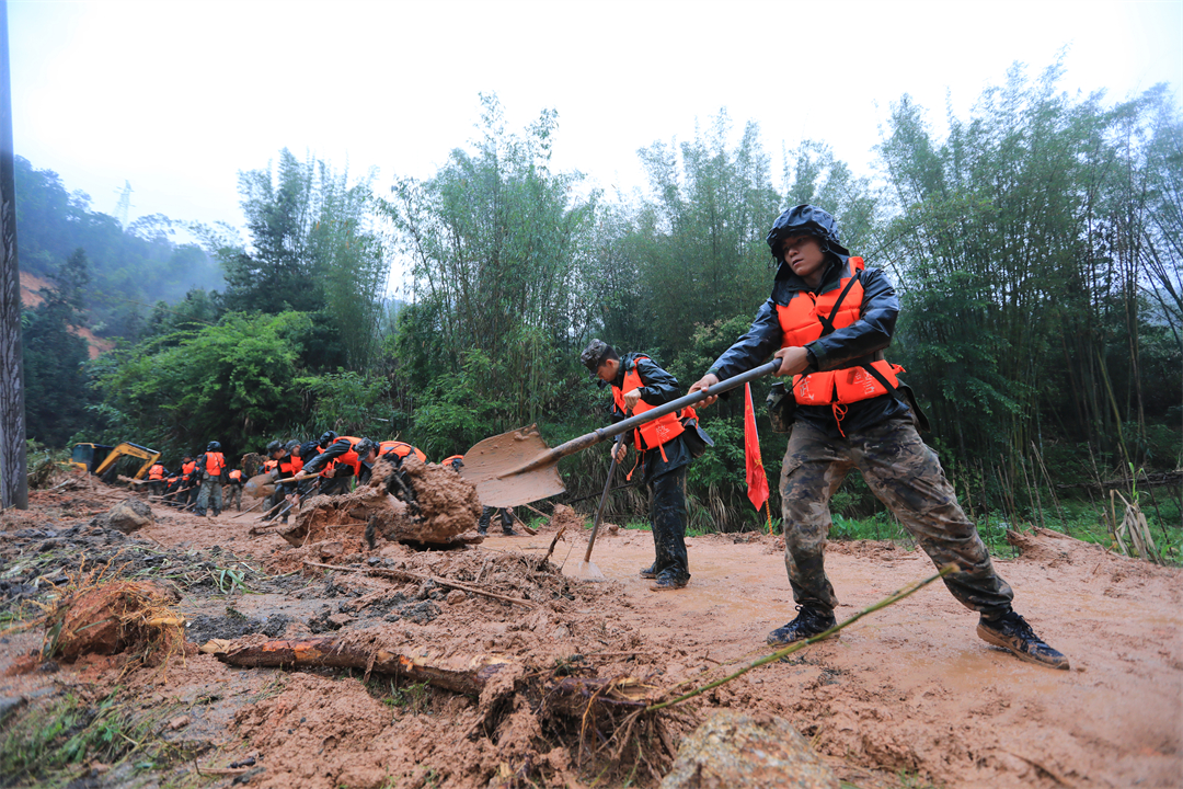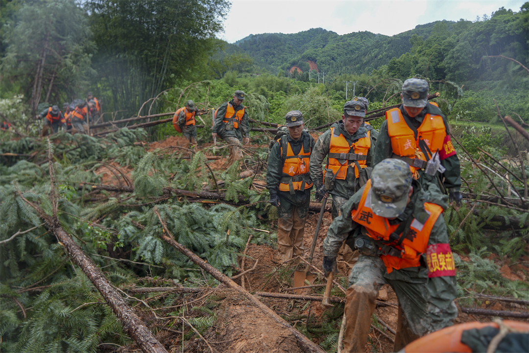 圖為武警廣東總隊(duì)韶關(guān)支隊(duì)官兵正在進(jìn)行道路清障。