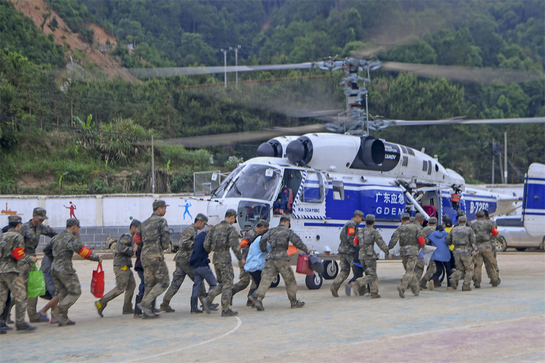 圖為武警廣東總隊(duì)韶關(guān)支隊(duì)官兵護(hù)送受災(zāi)群眾登機(jī),前往安全地域。