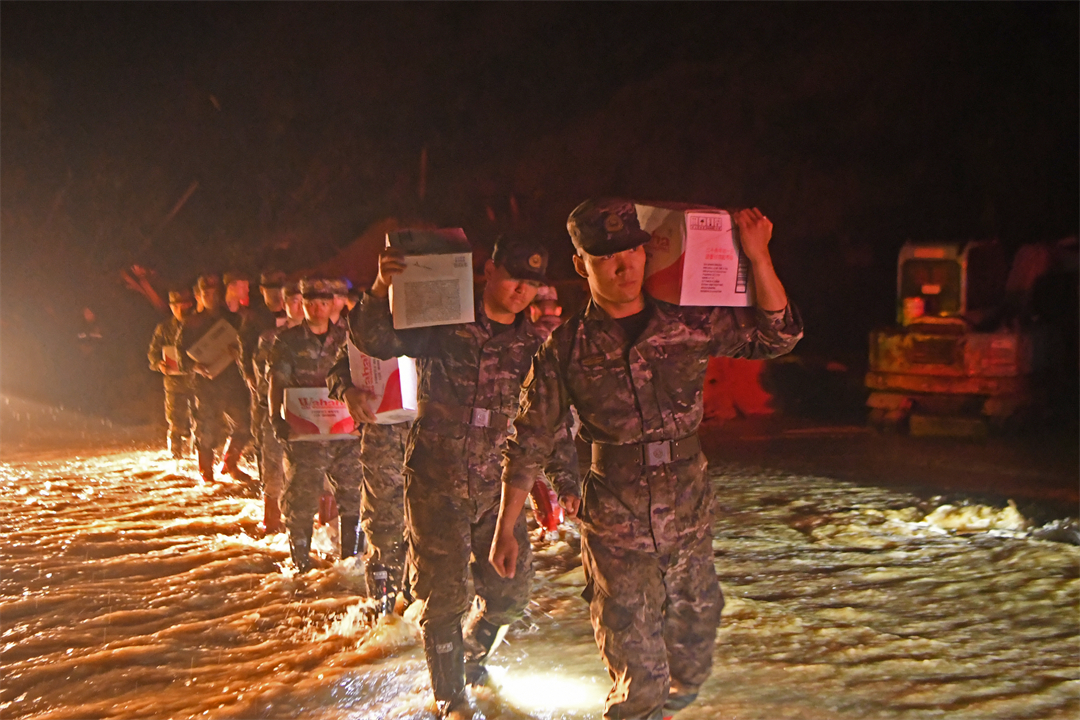 22日夜間,由于能見度不佳,道路搶通工作暫時(shí)停止,武警官兵采取接力的方式,將直升機(jī)、運(yùn)輸車等交通工具送達(dá)的物資進(jìn)行二次轉(zhuǎn)運(yùn),目前能保證受災(zāi)群眾基本的飲用水和食物需求。