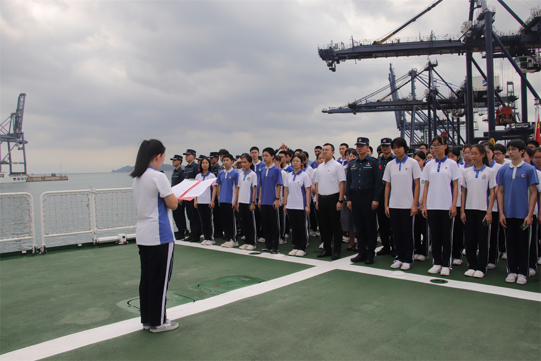 入團(tuán)儀式在嘹亮的國(guó)歌聲中拉開序幕。全體人員在深圳海警局德洲艦甲板上肅立,高聲齊唱國(guó)歌。隨后,與會(huì)領(lǐng)導(dǎo)為新團(tuán)員頒發(fā)團(tuán)徽和團(tuán)員證。全體團(tuán)員面向團(tuán)旗莊嚴(yán)宣誓,兩名團(tuán)員代表作了慷慨激昂的發(fā)言。最后,羅湖區(qū)教育局領(lǐng)導(dǎo)致辭寄語,勉勵(lì)全體團(tuán)員為中華民族偉大復(fù)興不懈奮斗。