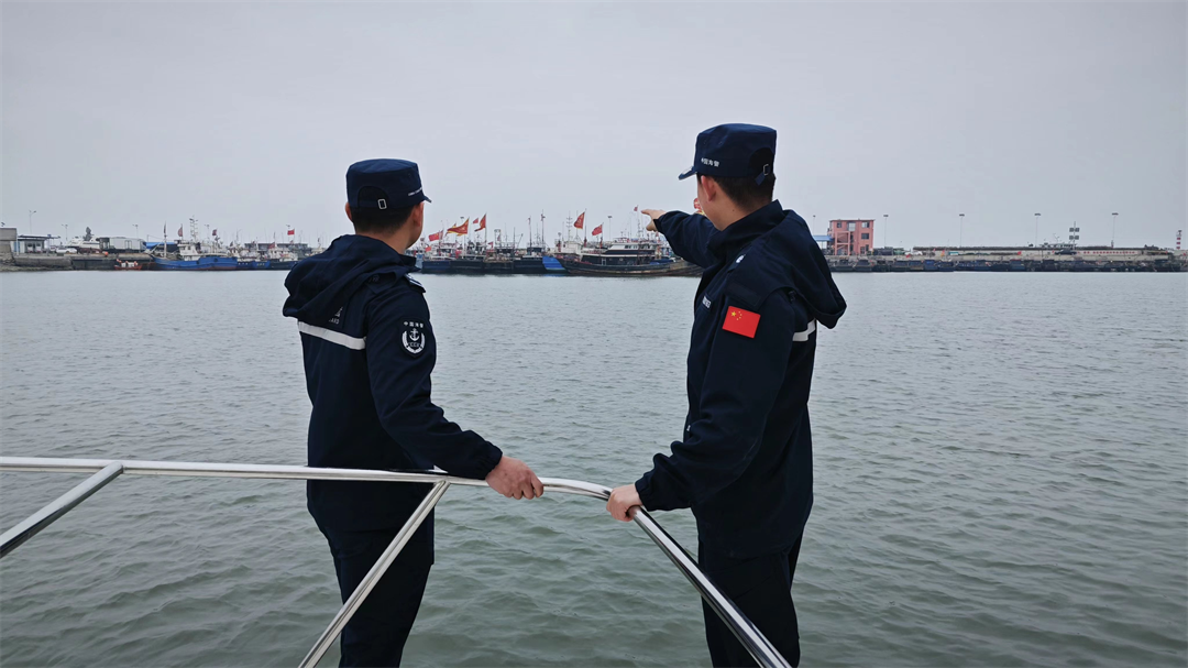 圖為海警執(zhí)法員巡查漁港碼頭。