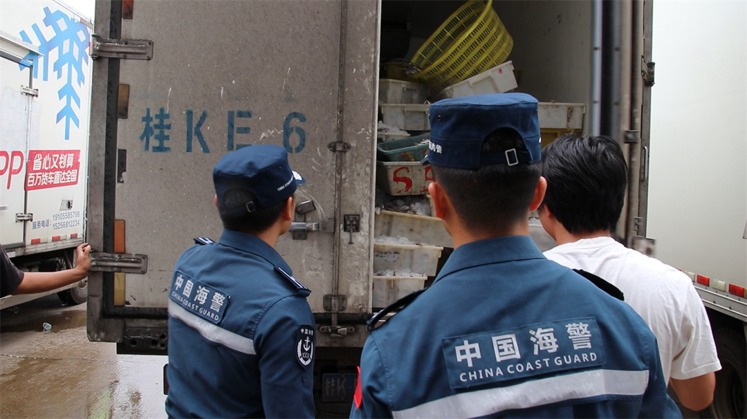 圖為海警執(zhí)法員對查獲的漁獲物進行檢查。