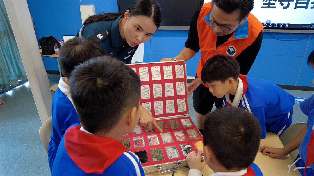 圖為海警執(zhí)法員向同學們講解毒品類型。