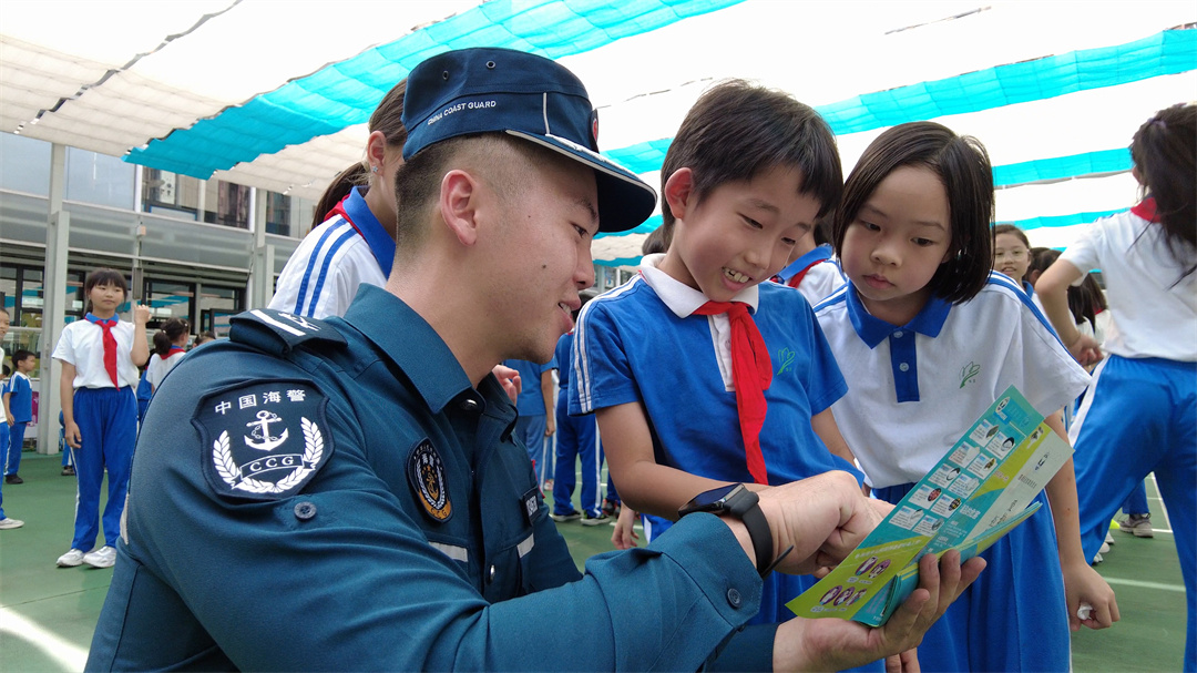 圖為海警執(zhí)法員向同學們發(fā)放禁毒預防宣傳折頁。