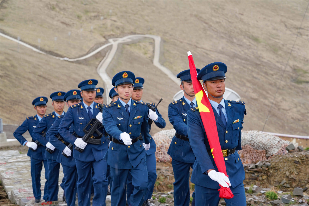 一路登高向上,氧氣逐漸稀薄,高原反應(yīng)不期而至,但大家參與的熱情卻格外高漲。湛藍的天空,屹立的雷達防風罩,伴隨著雄壯的國歌聲,鮮艷的五星紅旗冉冉升起。在海拔5374米的陣地上,大家迎著勁風肅然佇立,仰望國旗致敬,向著雪山和甘愿奉獻青春、守衛(wèi)祖國領(lǐng)空的戰(zhàn)士致敬!