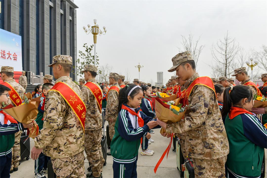 圖為臨沭縣小學(xué)生代表為即將入伍新兵送花。