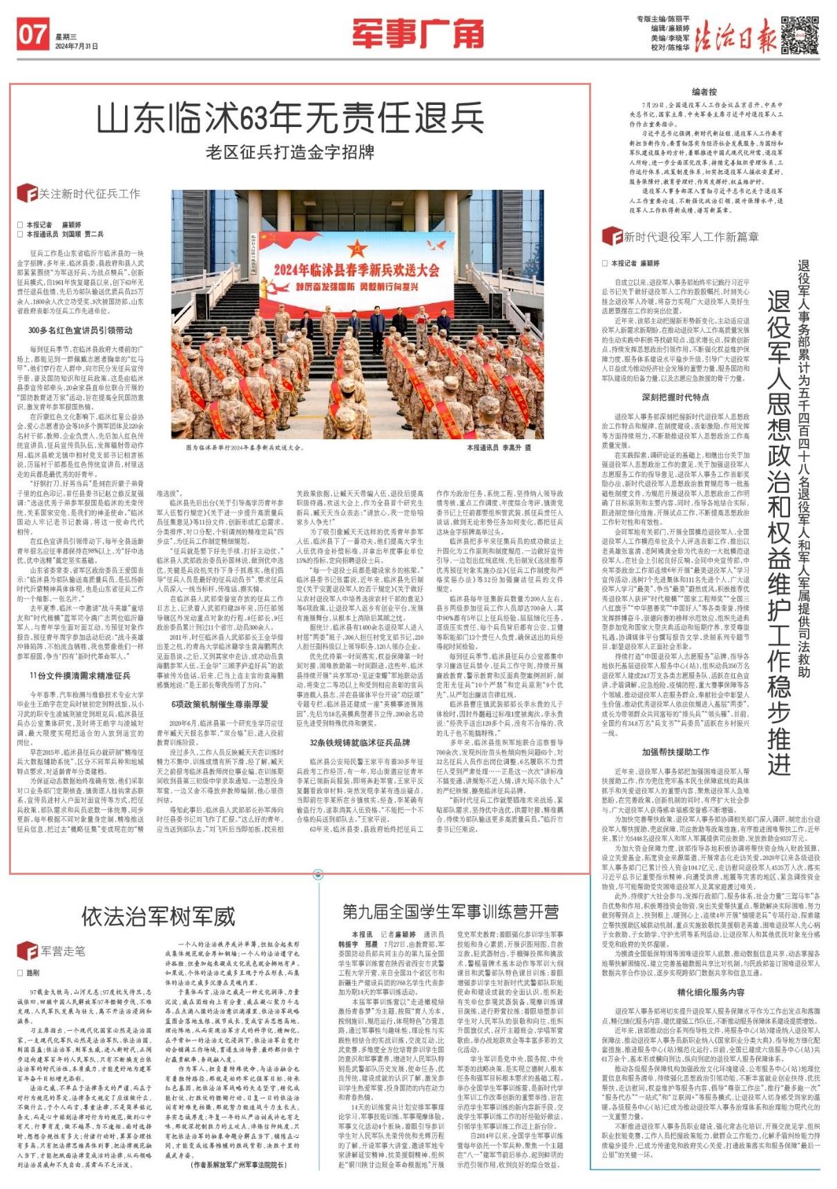 優(yōu)先優(yōu)待第一時(shí)間落實(shí),權(quán)益保障第一時(shí)間對(duì)接,困難救助第一時(shí)間跟進(jìn)。這些年,臨沭縣持續(xù)開展“共享軍功·見證榮耀”軍地聯(lián)動(dòng)活動(dòng),將榮立二等功以上和受到相應(yīng)表彰的官兵事跡載入縣志,并在縣媒體平臺(tái)開設(shè)“功臣頌”專題專欄。臨沭縣還建成一座“英模事跡展陳園”,先后為18名英模典型著書立傳,200余名功臣先進(jìn)受到特殊優(yōu)待和褒獎(jiǎng)。