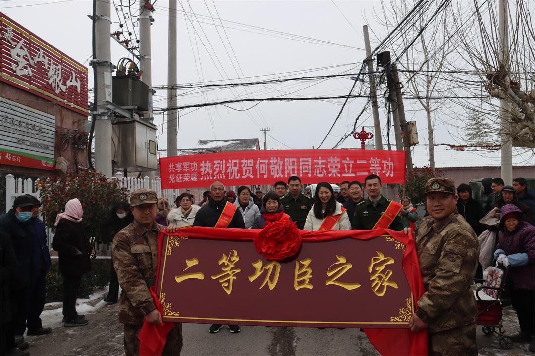 圖為臨沭縣軍地領(lǐng)導(dǎo)為榮立二等功人員送喜報(bào)。