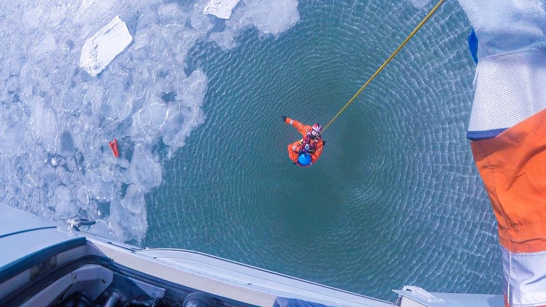 圖為海軍航空兵某部搜救員張闖首次進(jìn)行冰海救援。