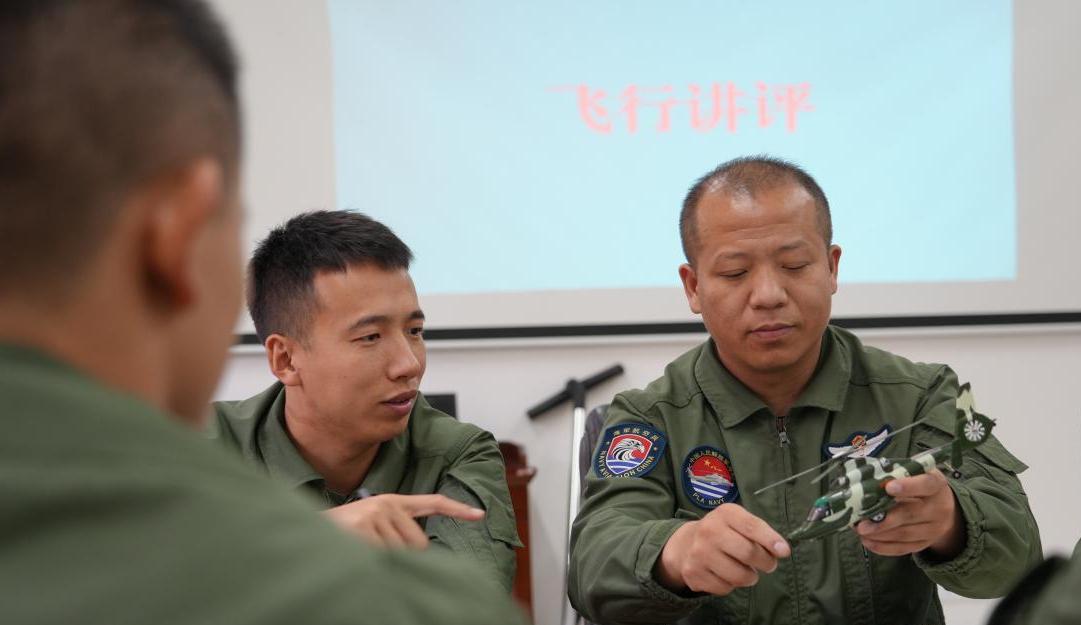 圖為張闖(右一)與戰(zhàn)友進(jìn)行飛行講評。