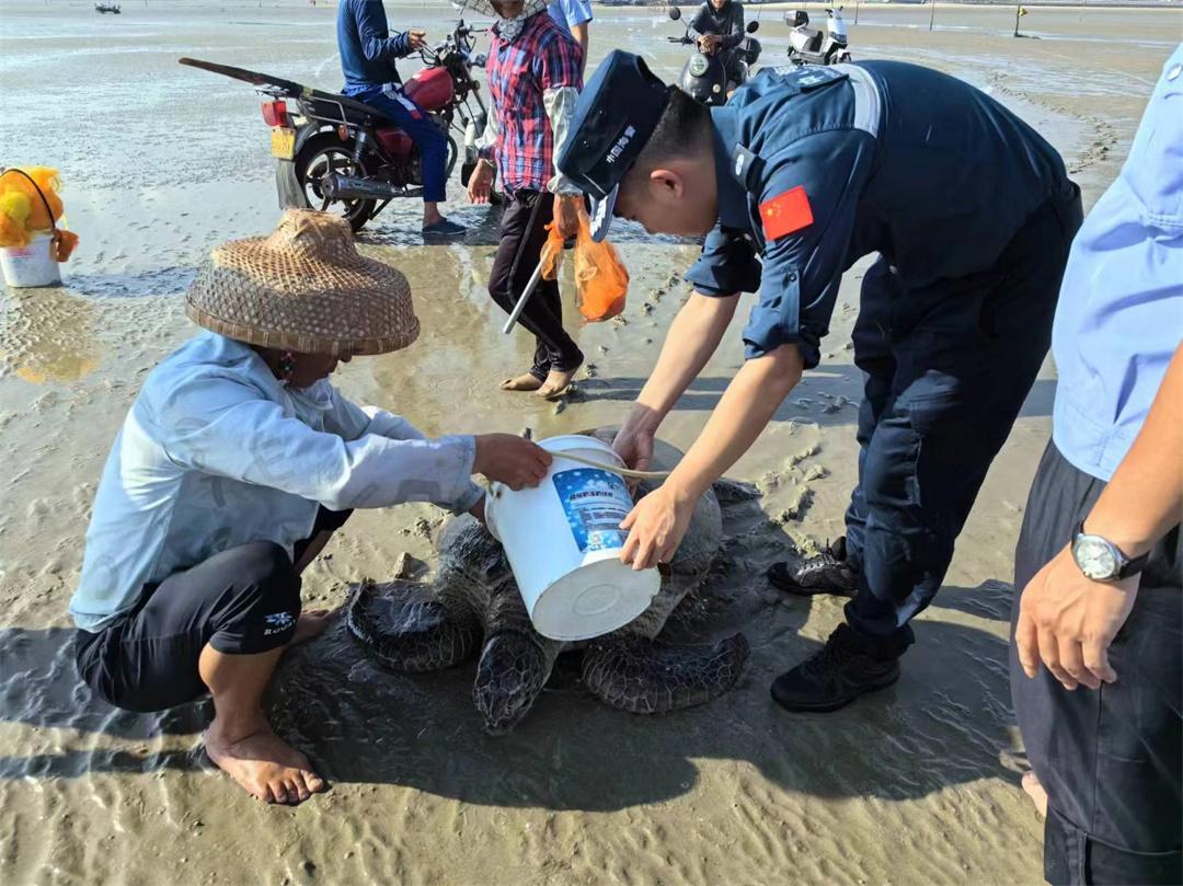 為避免綠海龜遭受二次傷害,執(zhí)法員一邊清理附近沙石雜物,一邊采用水桶澆水方式對其進(jìn)行保濕。觀察一段時(shí)間后,綠海龜生命體征和行動(dòng)能力開始逐漸恢復(fù),隨即被送至安全開闊海域放生。