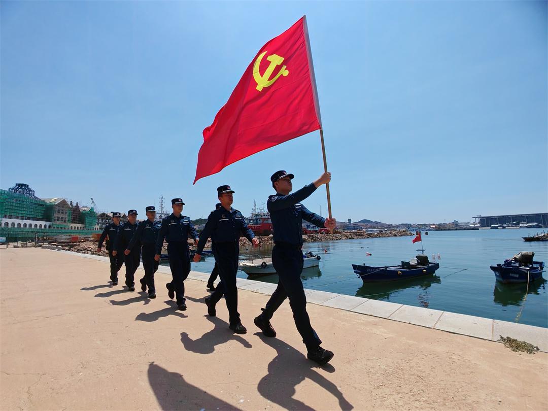 圖為7月1日,山東煙臺海警局長島工作站組織執(zhí)法員重溫入黨誓詞。盧煜萱 攝