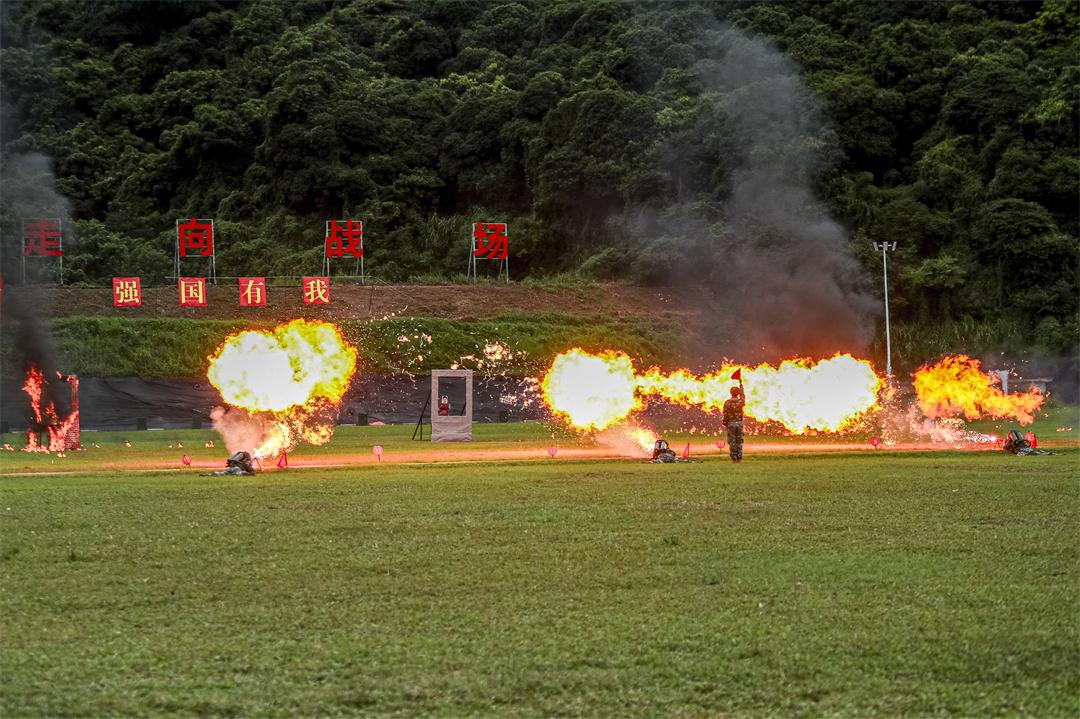 圖為官兵進(jìn)行噴火課目演示。