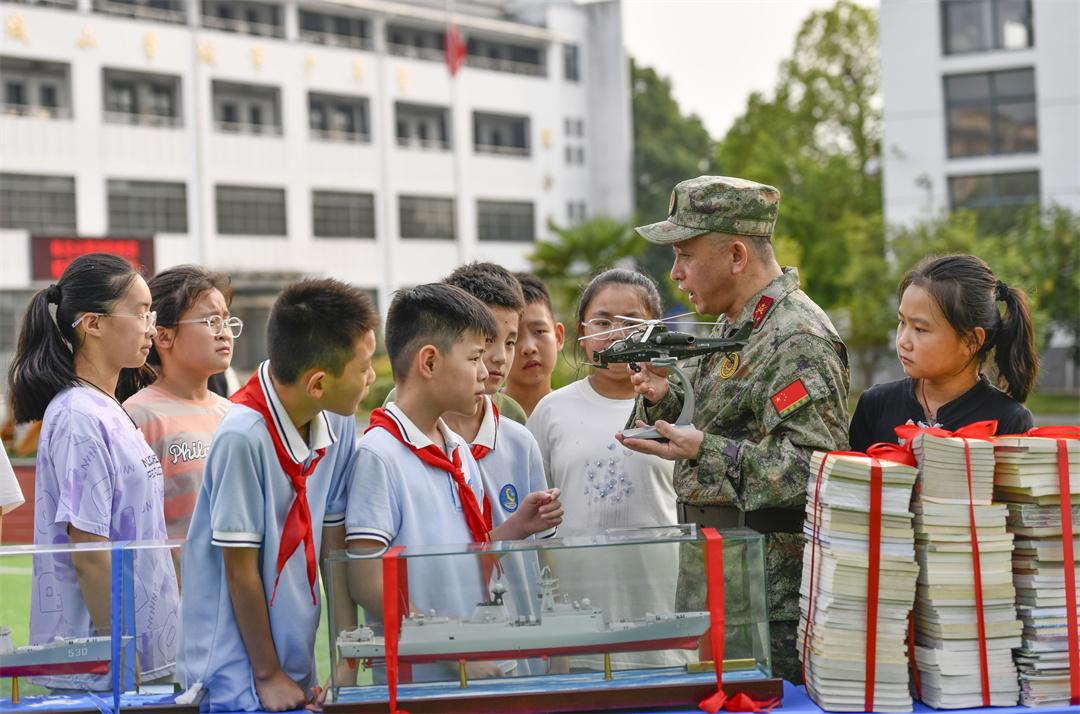 圖為合肥市廬陽區(qū)民兵向?qū)W生介紹武器裝備性能。