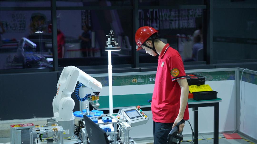 圖為工業(yè)機(jī)器人系統(tǒng)操作員比賽進(jìn)行中。
