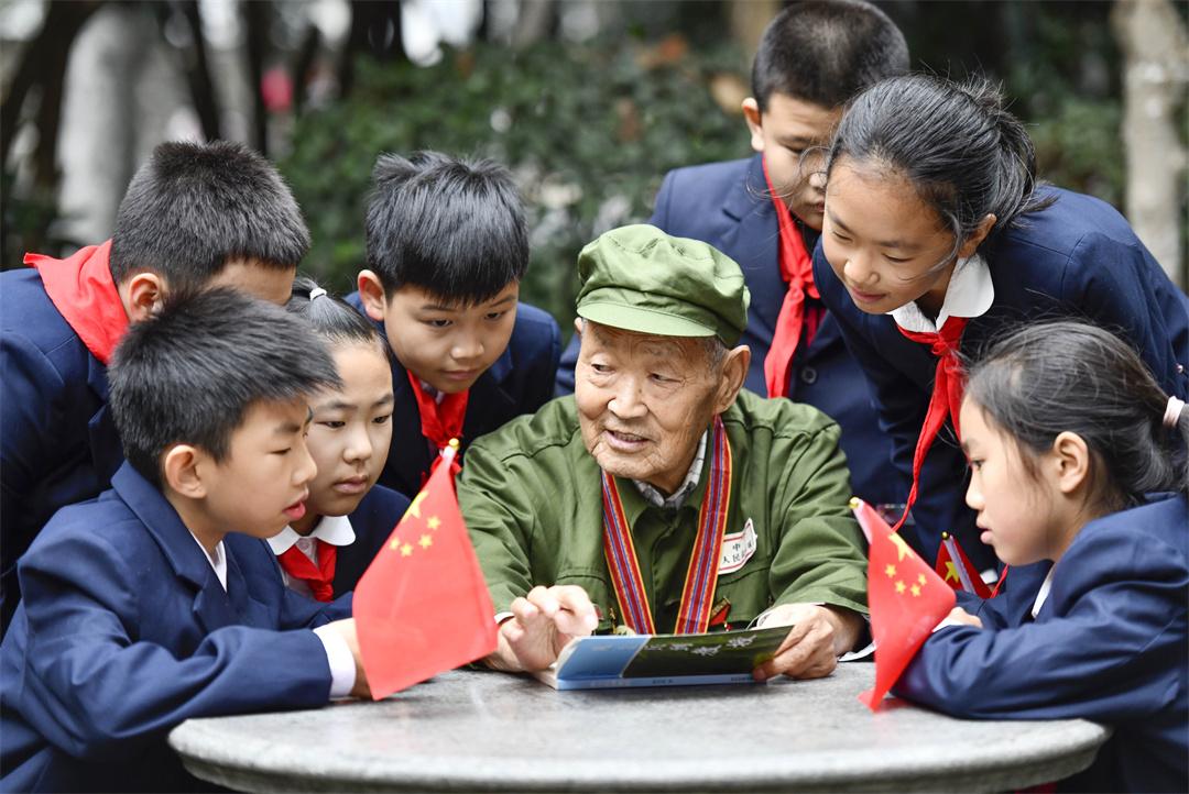 圖為89歲抗美援朝老兵楊克美和孩子們在一起。