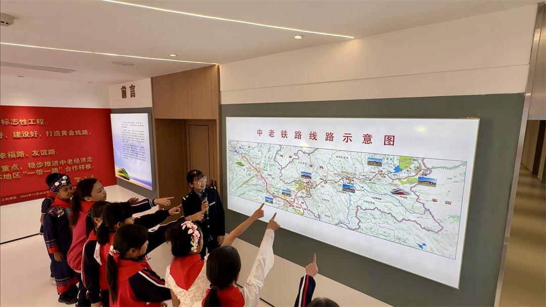 國(guó)旗傳遞儀式結(jié)束后,少先隊(duì)員們與普洱車務(wù)段磨憨站工作人員在磨憨鐵路口岸智慧展示中心開展“紅領(lǐng)巾愛祖國(guó)”交流活動(dòng)。中心有關(guān)負(fù)責(zé)同志為少先隊(duì)員們講述了中老鐵路建設(shè)發(fā)展歷程。