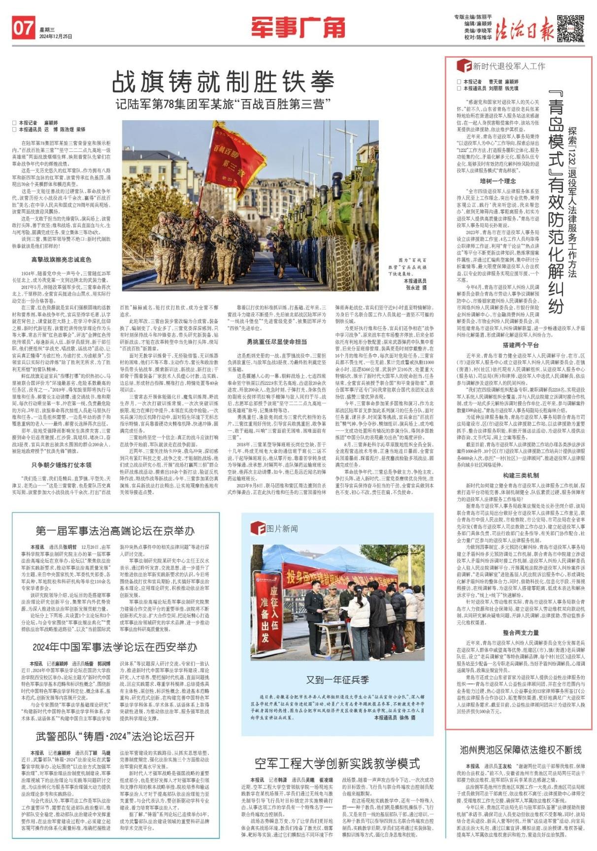 2023年,青島市在市退役軍人事務(wù)局設(shè)立法律援助工作室,4名工作人員均取得公職律師工作證,利用“青干論法”“熱點講法”等平臺不斷更新法律知識,熟練掌握案件屬性,并通過匯編典型案例、集中研討分析案情等,最大限度保障退役軍人合法權(quán)益,以專業(yè)的法律服務(wù)實現(xiàn)應(yīng)援盡援、一個不落。