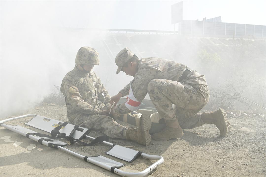 戰(zhàn)場情況瞬息變化,情況一個接著一個?!皥蟾嬷笓]員,我分隊遭敵襲擊,有2人受傷嚴重,無法繼續(xù)參加‘戰(zhàn)斗’。”“迅速組織傷員救護轉移?!庇傻胤结t(yī)療專業(yè)力量組成的醫(yī)療救護分隊迅速反應,穿過濃煙趕赴“戰(zhàn)場”,現場對“傷員”進行止血、包扎處理后,用擔架轉移至救護車內組織后送。