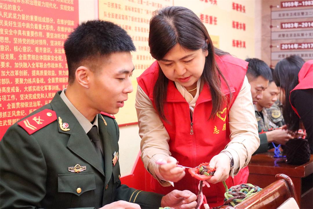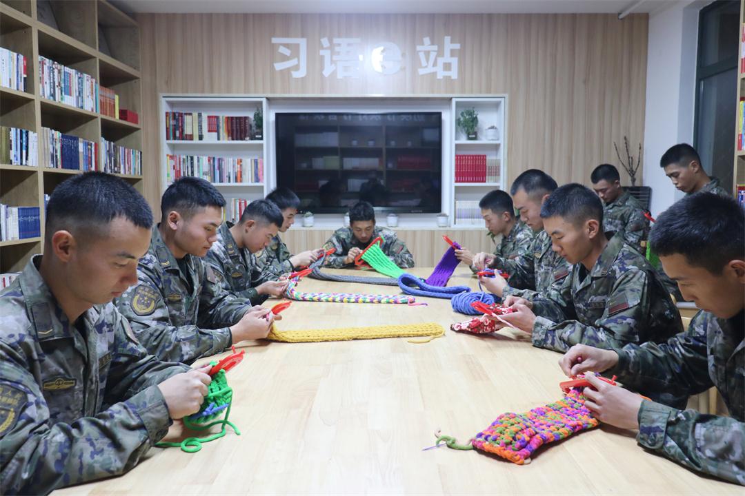 圖為武警官兵學(xué)習(xí)圍巾編織技法。