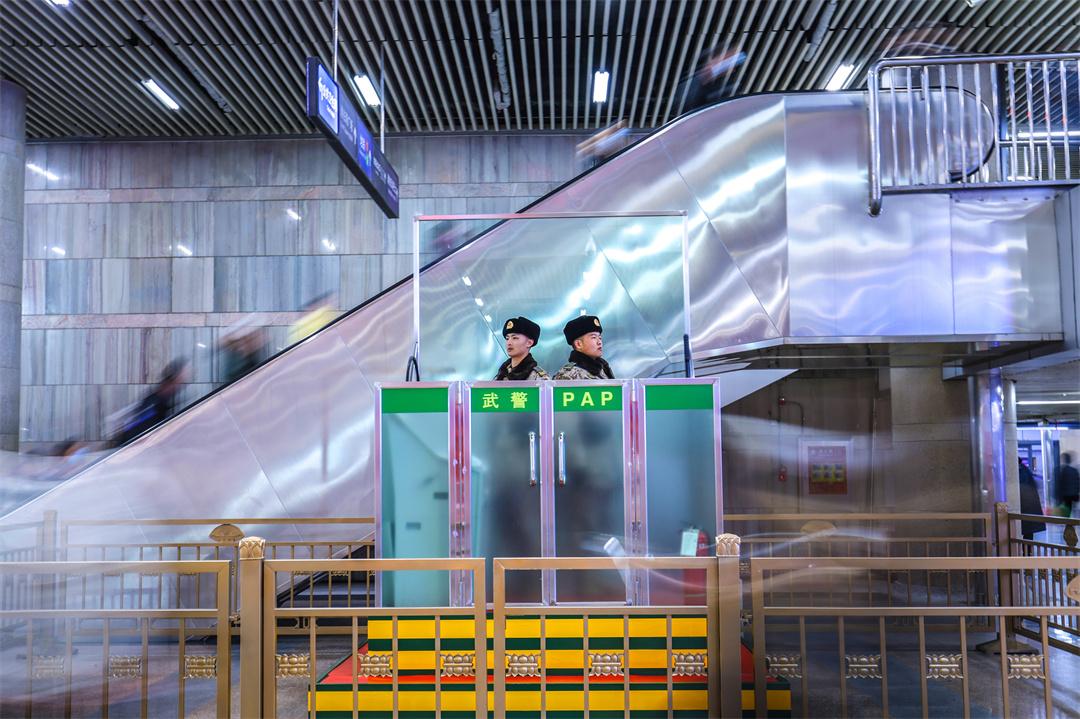 圖為北京西站地下通道內兩名武警正在認真履行職責。