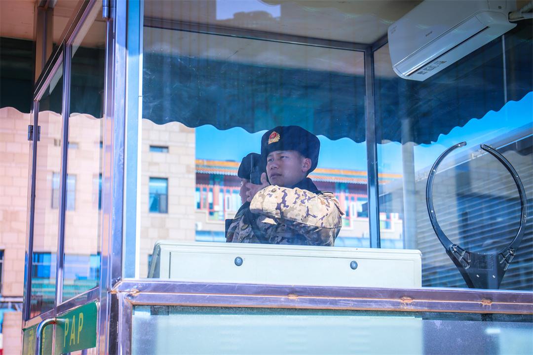 圖為執(zhí)勤武警正在進行互通互聯(lián)。