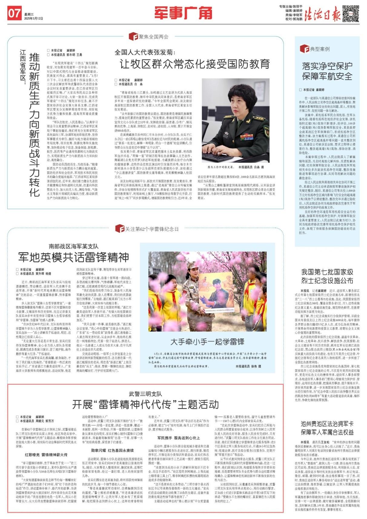 在第62個(gè)學(xué)雷鋒紀(jì)念日到來之際,武警福建總隊(duì)三明支隊(duì)組織官兵深入學(xué)校、社區(qū)和老兵家中,開展“雷鋒精神代代傳”主題活動(dòng)。橄欖綠身影穿梭在駐地大街小巷,用實(shí)際行動(dòng)詮釋新時(shí)代軍民魚水深情。
