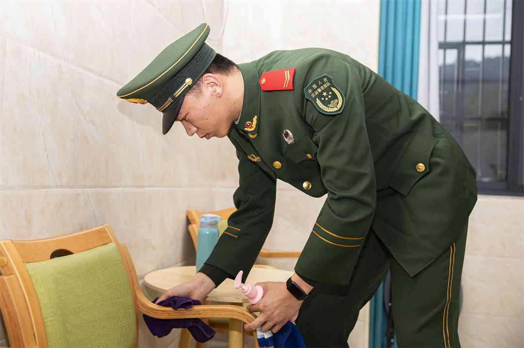 圖為武警官兵幫老人整理房間衛(wèi)生。