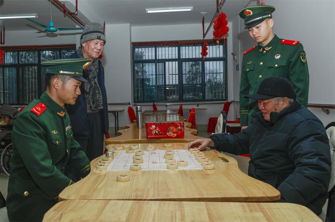 圖為武警官兵陪老人下象棋。