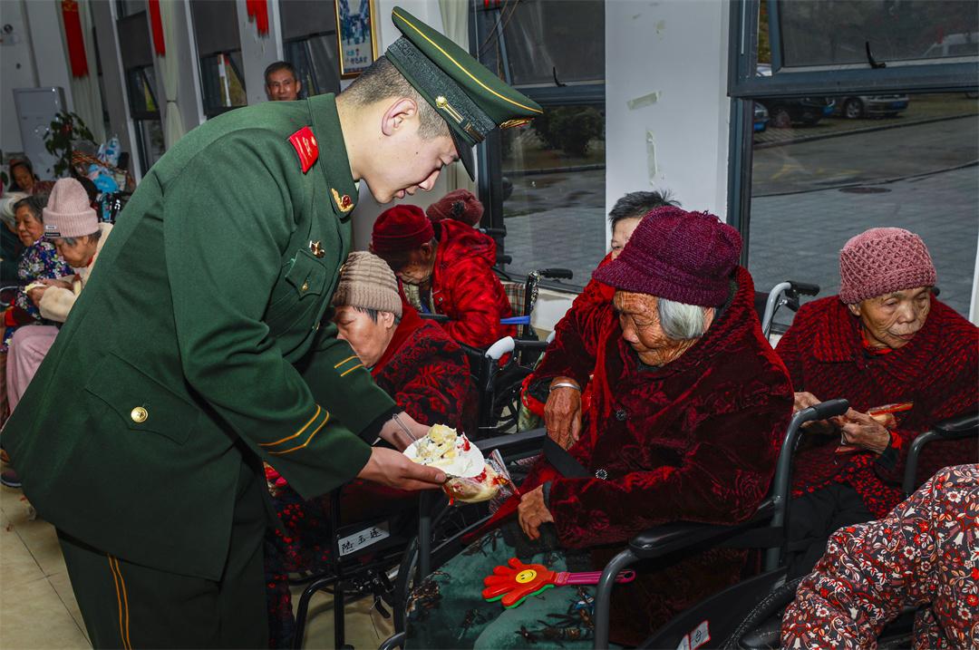 圖為武警官兵為老人分發(fā)蛋糕。