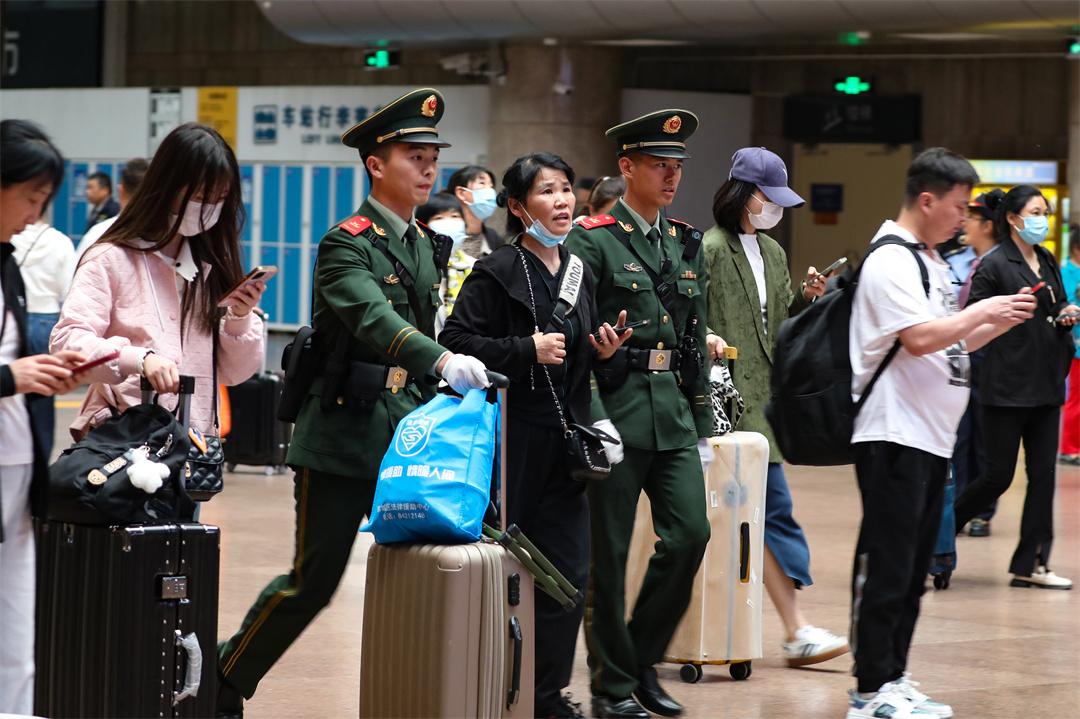 今年五一假期,北京地區(qū)迎來雙向出行高峰,各大交通樞紐客流激增。假期首日,北京西站客流量近40萬人次,擔(dān)負(fù)北京西站守衛(wèi)任務(wù)的武警北京總隊執(zhí)勤第六支隊官兵堅守執(zhí)勤崗位,熱心為旅客提供幫助,全力守護(hù)旅客平安出行。