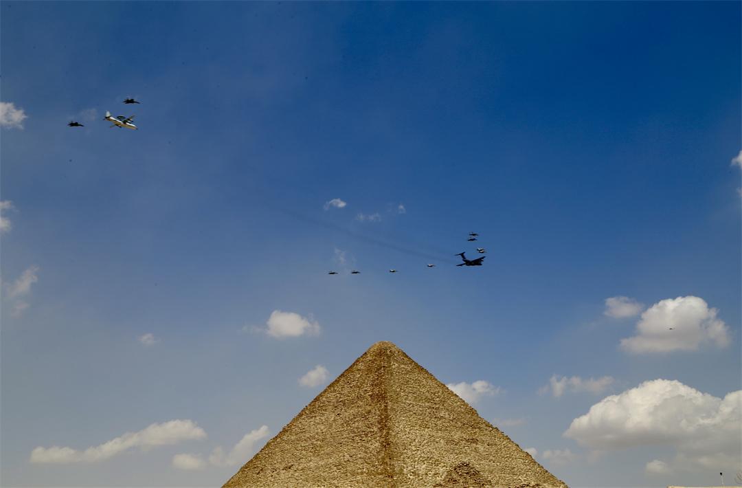 圖為中??哲婏w機組成編隊飛過金字塔。