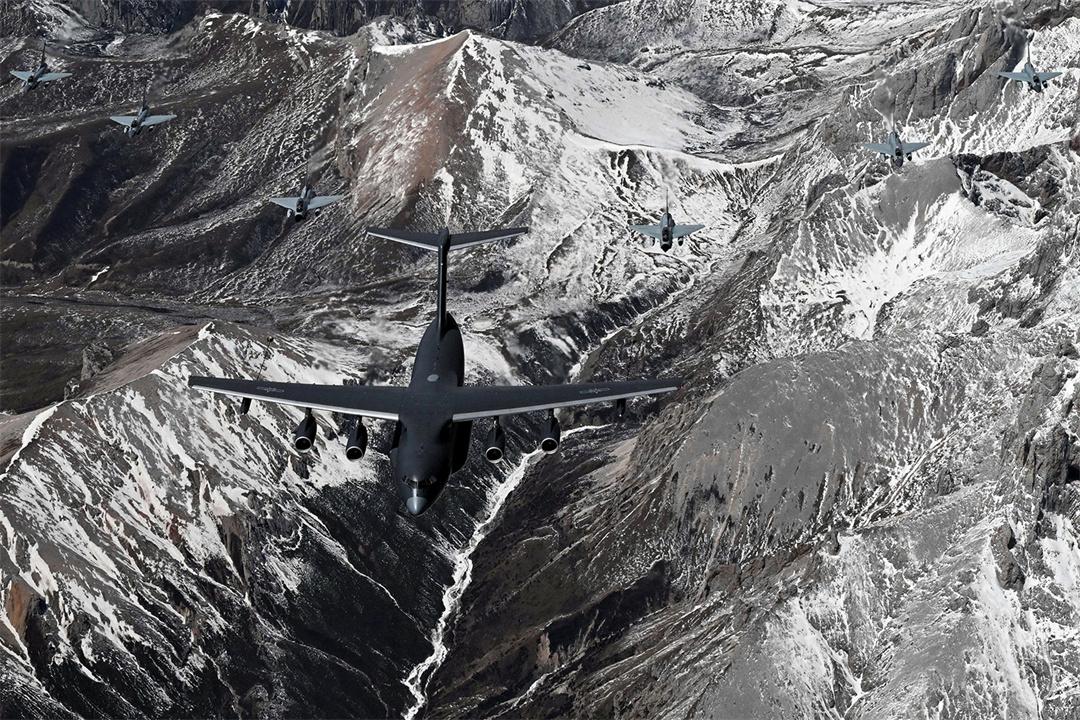 圖為4月12日,中國境內,參加中?!拔拿髦?2025”空軍聯(lián)合訓練的運油-20和殲-10戰(zhàn)機編隊飛躍雪山。余紅春 攝