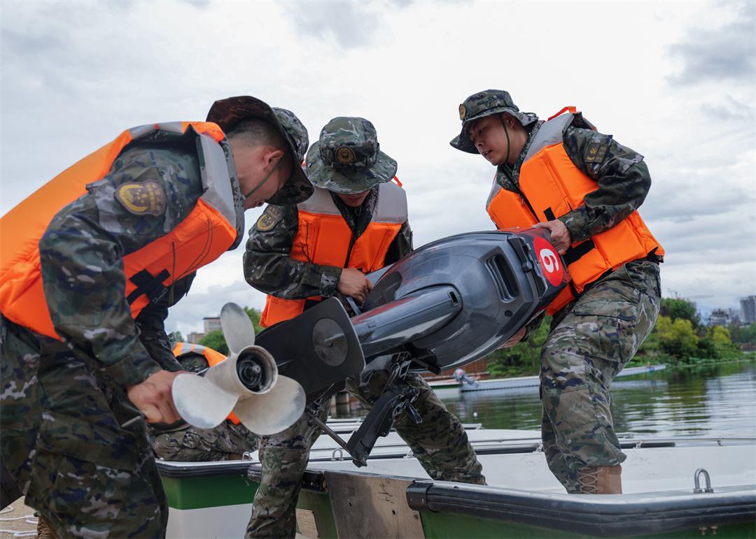 圖為武警官兵開展訓(xùn)練前安裝舟艇發(fā)動(dòng)機(jī)。歐家程 攝