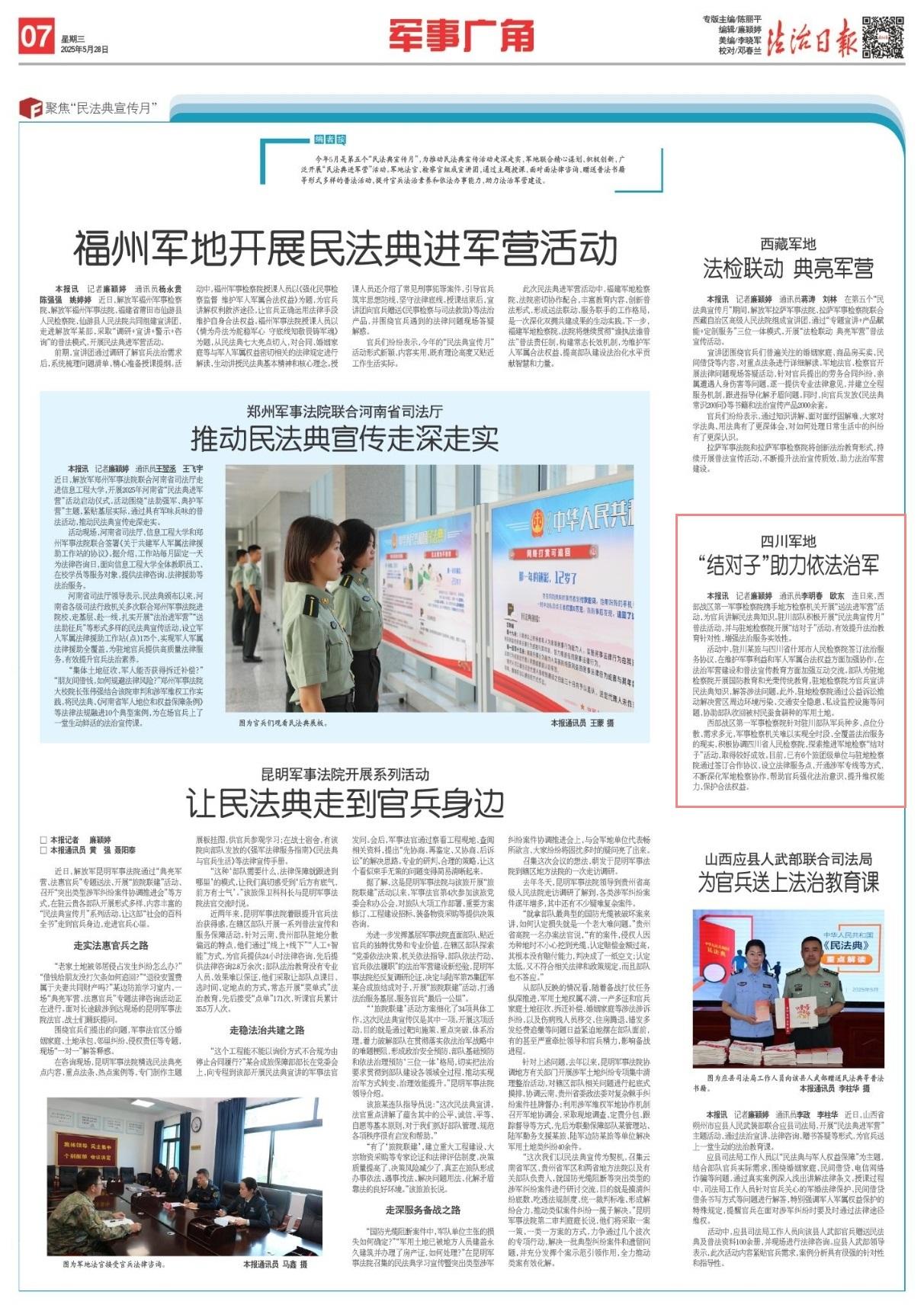 活動(dòng)中,駐川某旅與四川省什邡市人民檢察院簽訂法治服務(wù)協(xié)議,在維護(hù)軍事利益和軍人軍屬合法權(quán)益方面加強(qiáng)協(xié)作,在法治軍營建設(shè)和普法宣傳教育方面加強(qiáng)互動(dòng)交流。部隊(duì)為駐地檢察院開展國防教育和光榮傳統(tǒng)教育,駐地檢察院為官兵宣講民法典知識(shí),解答涉法問題。此外,駐地檢察院通過公益訴訟推動(dòng)解決營區(qū)周邊環(huán)境污染、交通安全隱患、私設(shè)監(jiān)控設(shè)施等問題,協(xié)助部隊(duì)收回被村民蠶食耕種的軍用土地。