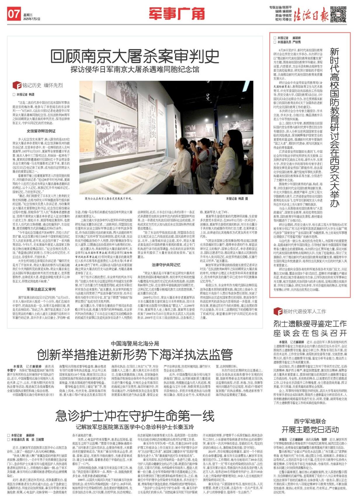 6月26日至27日,新時代高校國防教育研討會在西安交通大學(xué)舉辦。本次研討會以“推動新時代高校國防教育高質(zhì)量發(fā)展”為主題,圍繞高校國防教育學(xué)科建設(shè)、課程設(shè)置、內(nèi)容要求、方法手段和特點(diǎn)規(guī)律等方面交流經(jīng)驗(yàn)做法、研究探討面臨的矛盾問題,共商推動新時代高校國防教育高質(zhì)量發(fā)展大計。