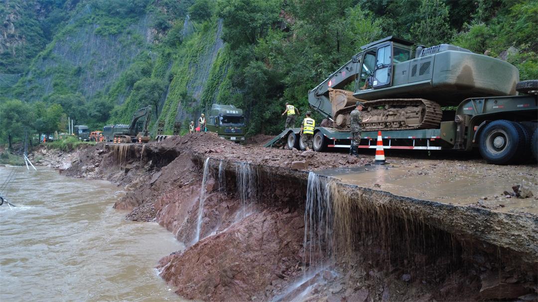 山洪造成多處道路中斷,人員車輛無(wú)法通行,武警官兵采取人歇機(jī)不歇的方式連夜搶通道路。