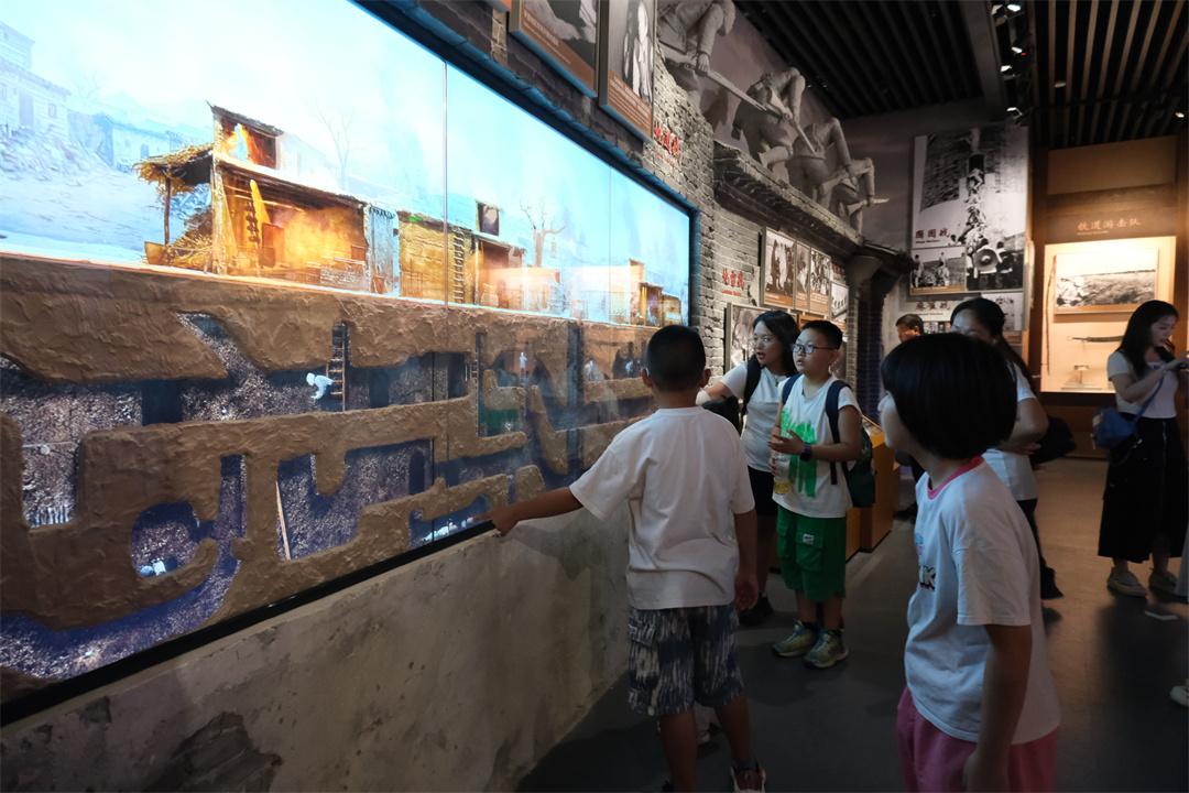 圖為在地道戰(zhàn)互動(dòng)屏幕前認(rèn)真觀看的孩子們。