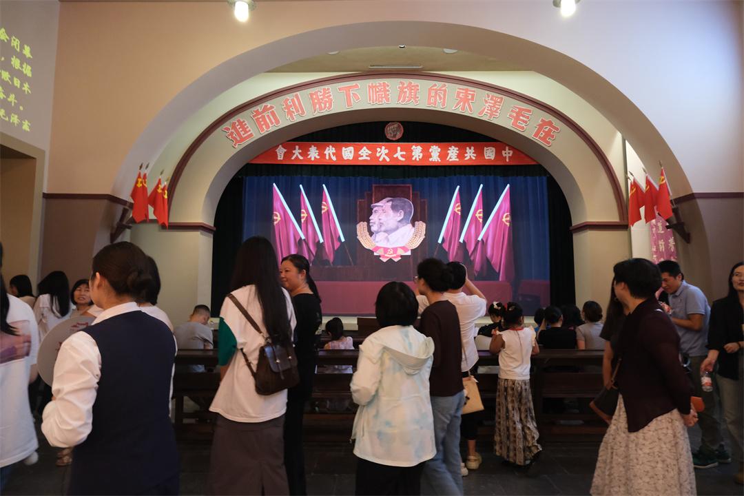 復(fù)原場景的長條木桌上藏著“時(shí)空機(jī)”,中國地質(zhì)大學(xué)學(xué)生雷鳴參考當(dāng)時(shí)的座次表,擇席“參會(huì)”。前方大屏幕上播放著毛澤東在黨的七大的影像資料,雷鳴說:“黨的七大在歷史上具有重要里程碑意義,坐在木桌前,好像自己也回到當(dāng)時(shí)的會(huì)場,這種感覺很奇妙?!?/p>