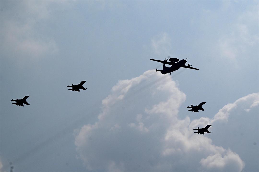 戰(zhàn)鷹呼嘯,首先飛過來的是預警指揮機梯隊??站?500A與殲-16戰(zhàn)機編隊、空警-600與殲-15T艦載機編隊依次接受檢閱。長空千里眼,云天中軍帳。隨著國產(chǎn)新型預警機研制列裝,我軍指揮控制、預警探測、協(xié)同打擊能力顯著提高。