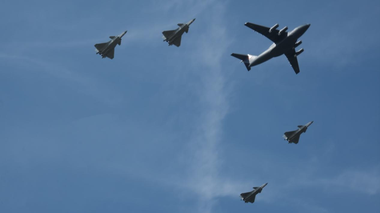 圖為運(yùn)-20和4架殲-20編隊(duì)飛臨沈陽桃仙國際機(jī)場上空。