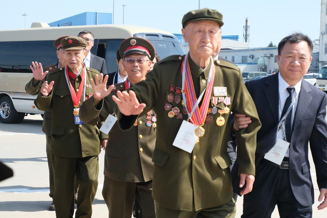 圖為來到現(xiàn)場的抗美援朝老戰(zhàn)士向現(xiàn)場人群招手示意。