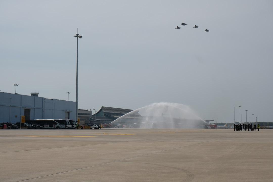 10時(shí)57分,空軍運(yùn)-20專機(jī)緩緩降落在沈陽桃仙國際機(jī)場。專機(jī)進(jìn)入中國領(lǐng)空后,空軍4架殲-20戰(zhàn)斗機(jī)護(hù)航,運(yùn)-20使用“跨江50”呼號(hào),4架殲-20使用“凱旋”呼號(hào),“雙20”同框向志愿軍烈士致以崇高敬意?!拔鍣C(jī)編隊(duì)”在機(jī)場上空通場,桃仙國際機(jī)場以“過水門”航空最高禮儀迎接志愿軍烈士遺骸回家。