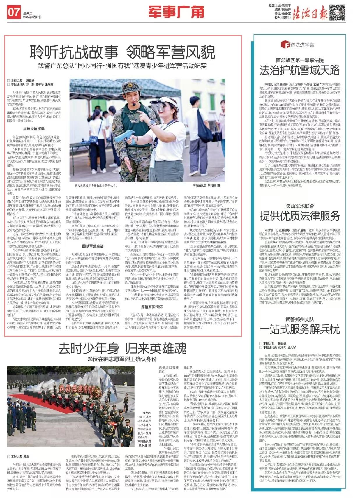 500余名香港青少年以及在廣東求學(xué)的港澳籍學(xué)生代表走進(jìn)武警部隊(duì)營區(qū),聆聽抗戰(zhàn)故事,領(lǐng)略軍營風(fēng)貌,體驗(yàn)軍人生活,和官兵們共同收獲一段難忘時(shí)光。