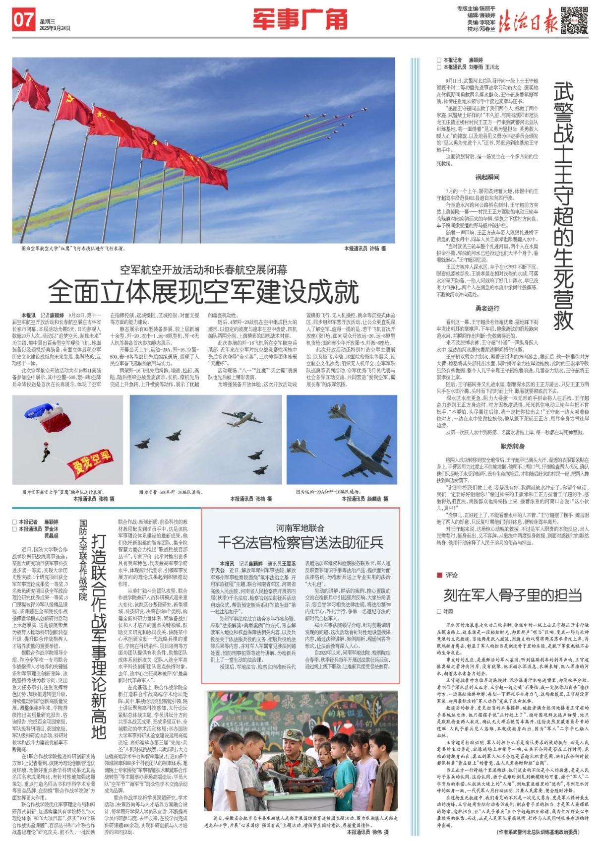 近日,解放軍鄭州軍事法院、解放軍鄭州軍事檢察院圍繞“筑牢法治之基 開(kāi)啟軍旅征程”主題,聯(lián)合河南省軍區(qū)、河南省高級(jí)人民法院、河南省人民檢察院開(kāi)展第四屆(秋季)千名法官、檢察官送法助征兵活動(dòng)啟動(dòng)儀式,幫助預(yù)定新兵系好軍旅生涯“第一粒法治扣子”。