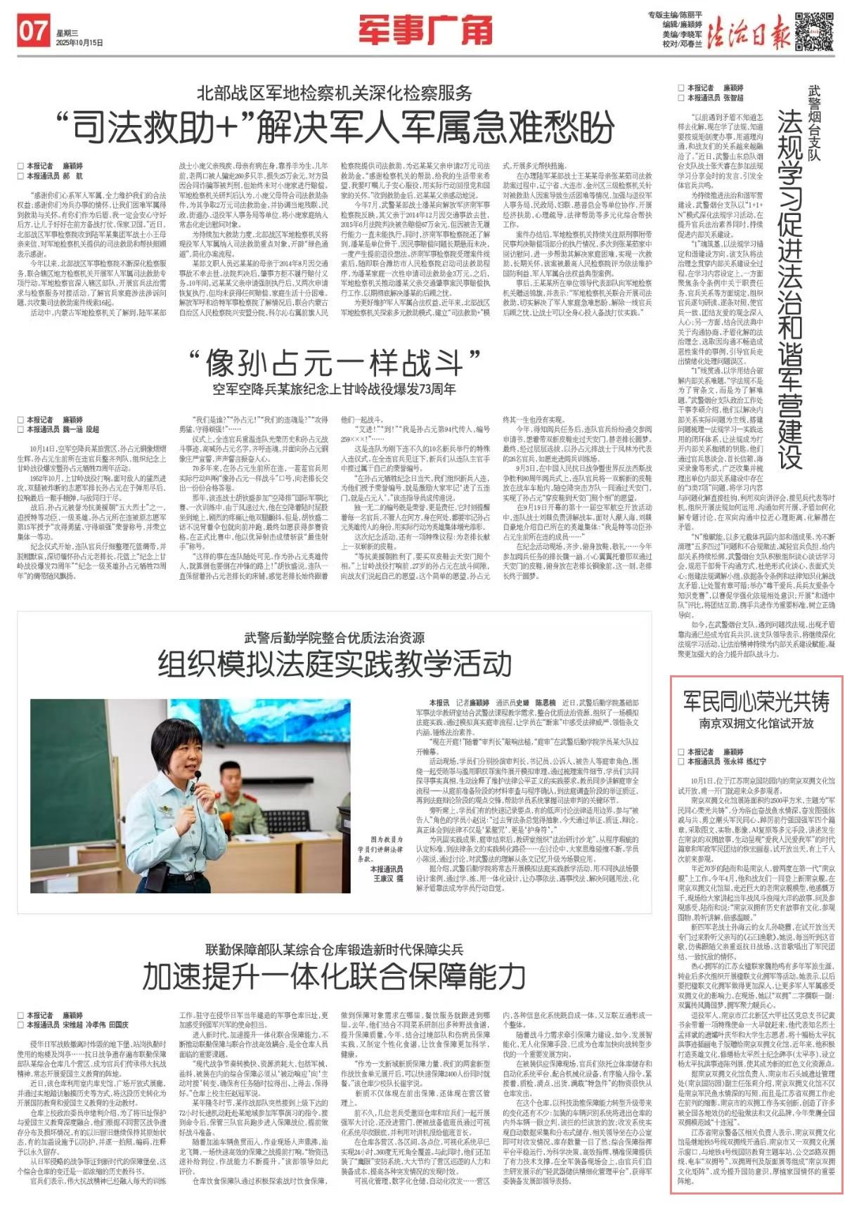 江蘇省南京警備區(qū)相關(guān)負(fù)責(zé)人表示,南京雙擁文化館是繼地鐵5號(hào)線雙擁線開通后,南京市又一雙擁文化展示窗口,與地鐵4號(hào)線國防教育主題車站、公交25路雙擁線、電車“雙擁號(hào)”、雙擁周刊及版面展等組成“南京雙擁文化矩陣”,成為提升國防意識(shí),厚植家國情懷的重要陣地。