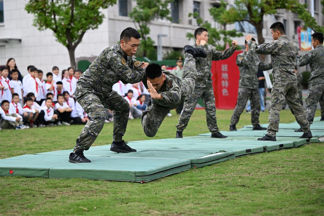 圖為武警戰(zhàn)士向小學生演示摔擒動作。