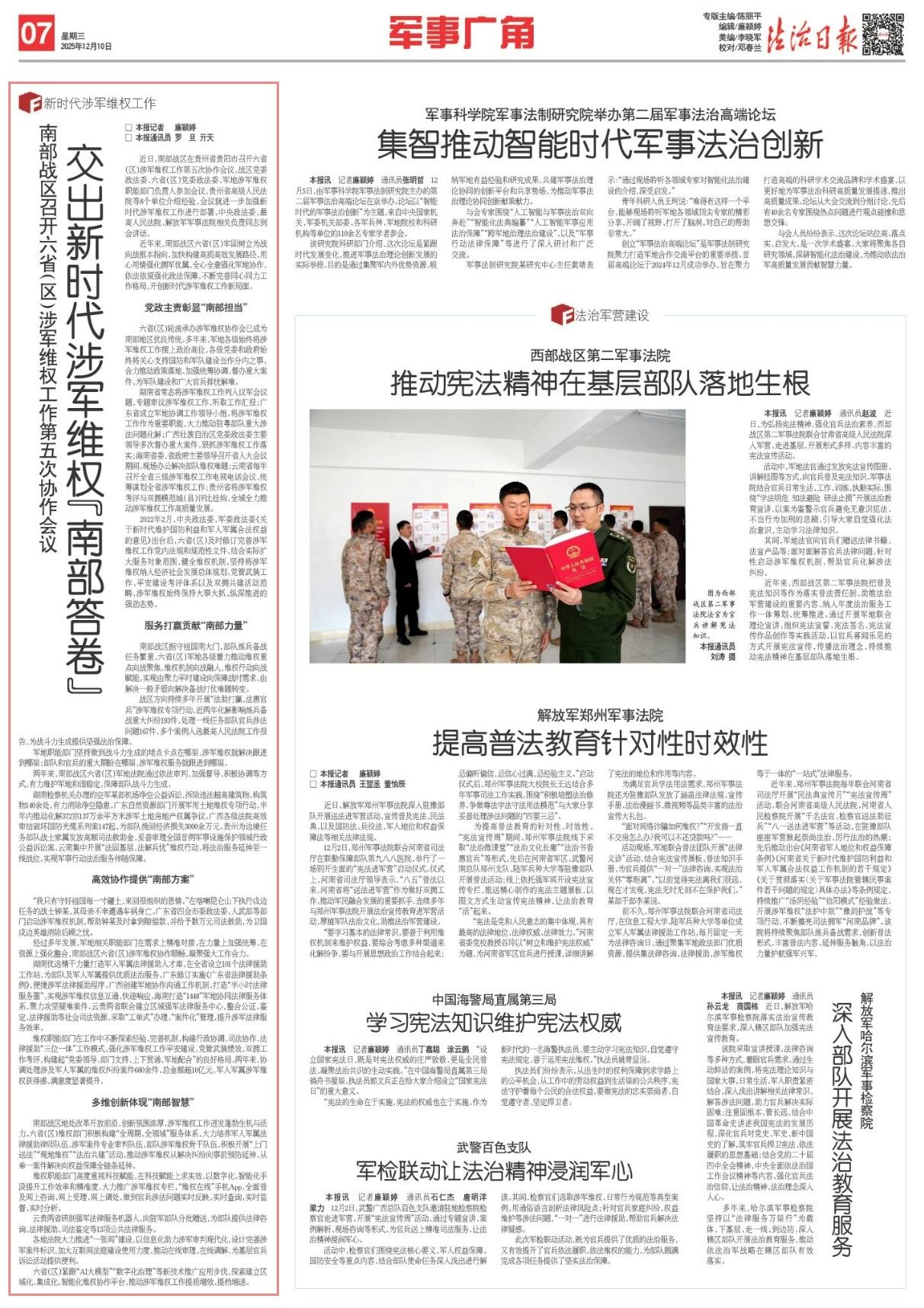 近年來(lái),南部戰(zhàn)區(qū)六?。▍^(qū))牢固樹(shù)立為戰(zhàn)向戰(zhàn)根本指向,加快構(gòu)建高質(zhì)高效發(fā)展路徑,用心用情強(qiáng)化擁軍優(yōu)屬,全心全意強(qiáng)化軍地協(xié)作,依法依規(guī)強(qiáng)化政法保障,不斷完善同心同力工作格局,開(kāi)創(chuàng)新時(shí)代涉軍維權(quán)工作新局面。