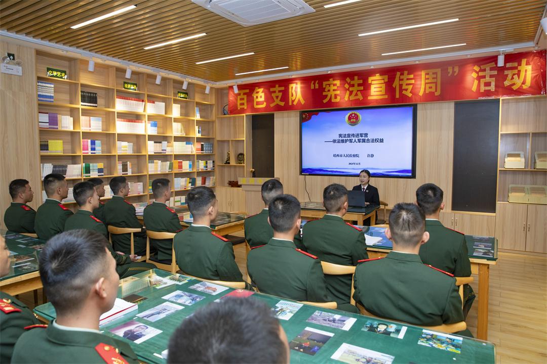 12月2日,武警廣西總隊(duì)百色支隊(duì)邀請(qǐng)駐地檢察院檢察官走進(jìn)軍營(yíng),開(kāi)展“憲法宣傳周”活動(dòng),通過(guò)專題宣講、案例解析、現(xiàn)場(chǎng)咨詢等形式,為官兵送上精準(zhǔn)司法服務(wù),讓法治精神浸潤(rùn)軍心。